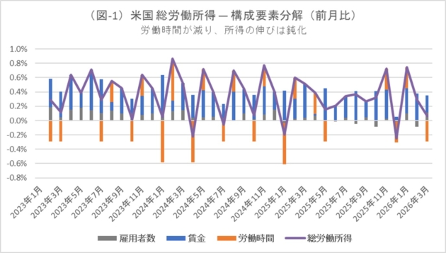 2026年3月の米雇用統計は、市場の予想を大きく上回る結果となった。一見すると、米国経済はなお底堅く、雇用環境も良好に見える。しかし、この改善は必ずしも雇用環境の好転を意味しない。総労働所得は前月比ほぼ横ばい。労働時間がマイナス寄与し、賃金上昇と総労働所得は鈍化している。